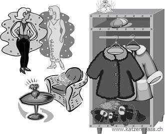 "Aha, meine Dosine ist gerade wieder dabei ihre Kleider auszusortieren. Das möchte ich mir wirklich nicht entgehen lassen. Schließlich, denke ich, wird sie ganz sicherlich meine Hilfe und meinen Rat dafür benötigen. So setzte ich mich erst einmal auf ihren Schreibtisch, um sie bei ihrem Vorhaben zu beobachten. Natürlich tat sie sich wie meistens sehr schwer mit der Auswahl, was bleibt und was entsorgt wird.