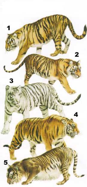 Weitere Tigerarten: Bali-Tiger, Java-Tiger und Kaspitiger. Diese drei Arten gelten leider als ausgestorben. Je nördlicher die Unterarten, desto grösser werden sie und desto blasser sind ihre Zeichnungen im Fell. Zudem unterscheiden sich die Streifenmuster. Leider werden auch heute noch vereinzelt Tiger gejagt und ihre Eingeweide für die Chinesische Medizin verwendet.