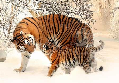 Tiger haben keine feste Paarungszeit. Das Weibchen bringt nur alle 3-5 Jahren Nachwuchs zur Welt. Nach einer Tragzeit von 95-112 Tagen werden an einer geschützten Stelle zwei bis vier Junge geboren. Die Kleinen sind zuerst blind und werden sofort von der Mutter gesäugt. Nach etwa zwei Wochen, wenn die ersten Zähne wachsen, öffnen die Jungen Ihre Augen und verlassen nach zwei Monaten zum ersten Mal das Versteck. Die Mutter bringt ihnen nun bereits Fleisch, säugt sie aber weiter, bis sie etwa sechs Monate alt sind. Jetzt dürfen die Tigerchen bereits mit auf die Jagd, um erste Erfahrungen zu sammeln und nach einem Jahr gehen sie selbständig auf Beutefang. Mit Zwei Jahren haben die Katzen so viel von ihrer Mutter gelernt, dass sie auch grosse Tiere fangen können und mit drei bis fünf Jahren verlassen sie ihre Mama, um sich neue Reviere zu suchen.